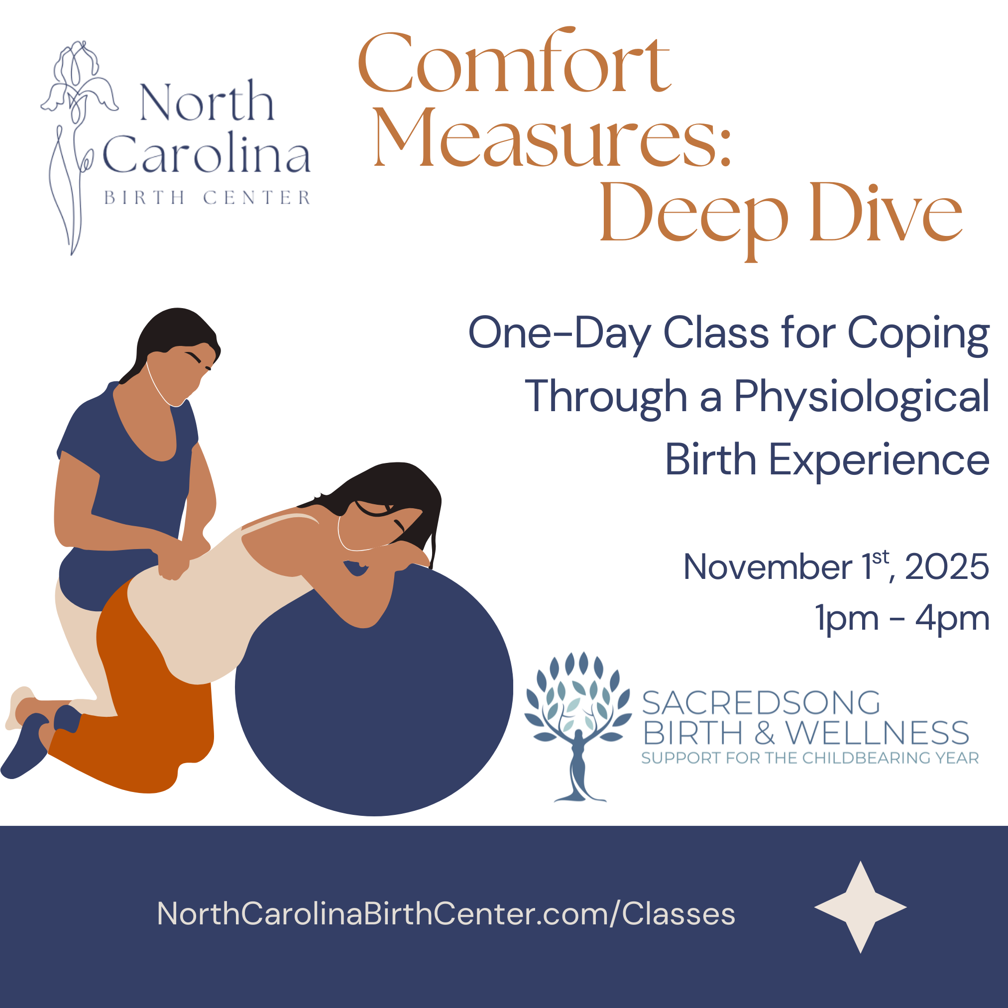 This class welcomes discussion, shares information in visual and written formats, and has hands on practice for comfort measures.